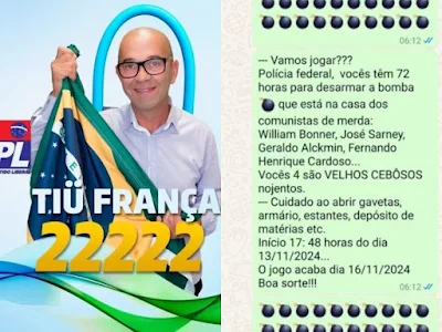 Francisco ainda estipulou prazos para os próximos atentados “Cuidado ao abrir gavetas, armário, estantes, depósito de matérias etc. Início 17:48 horas do dia 13/11/2024… O jogo acaba dia 16/11/2024 Boa sorte”, completou. O homem foi candidato a vereador pelo PL e faleceu após o atentado em Brasília. Do Portal Leo Dias